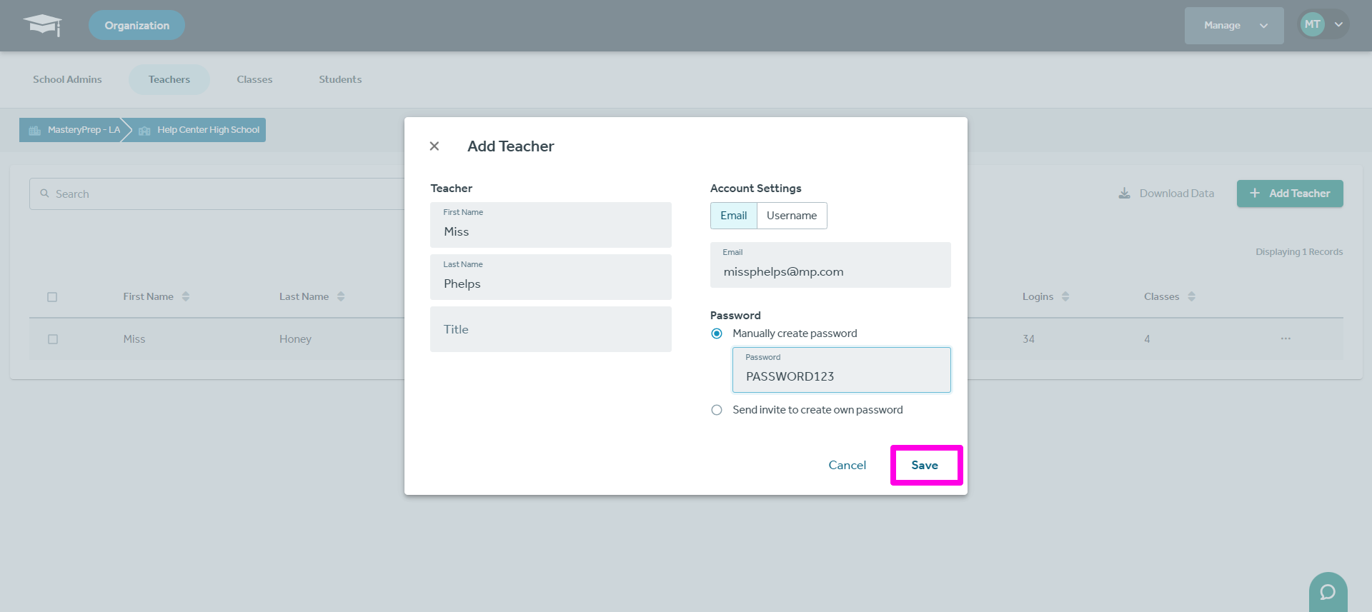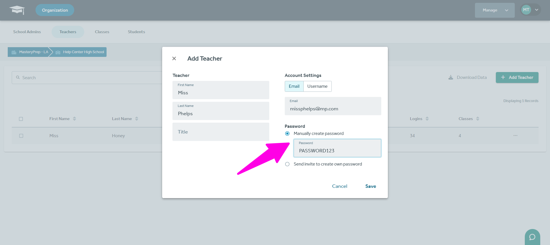 You can either create a password manually or send an email invite, though we highly recommend manually creating passwords as invitation emails often get directed to spam or blocked by district/institution-implemented firewalls resulting in incomplete accounts.