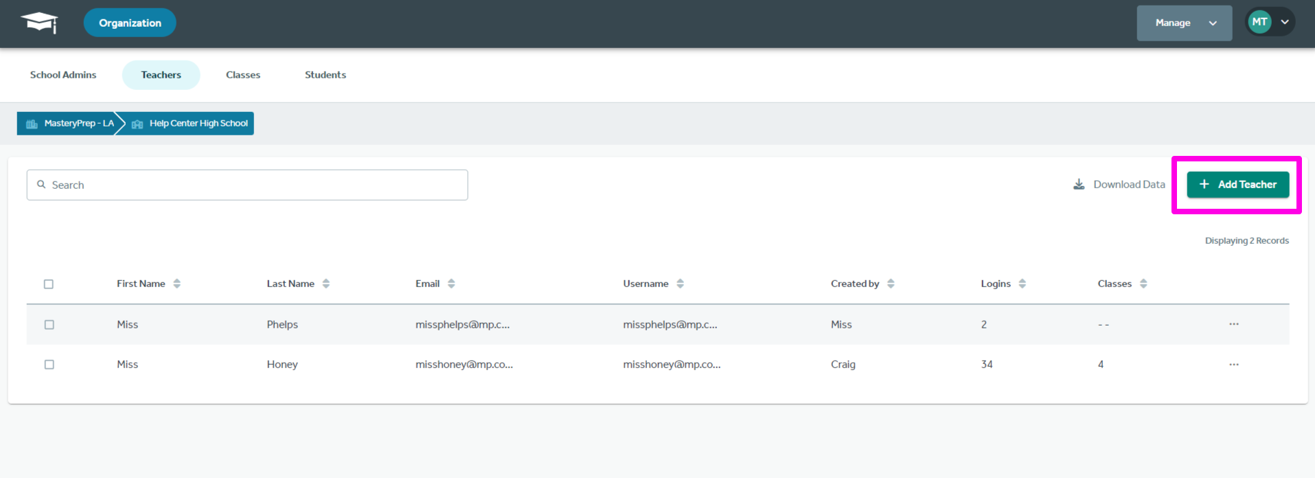 To add teachers specifically, select “Manage” located in the dropdown taskbar.