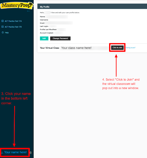 If your district is implementing a large-scale series of classes, we may have your MasteryPrep Platform account linked to your virtual classroom. You can join from the MasteryPrep Platform using the instructions below: